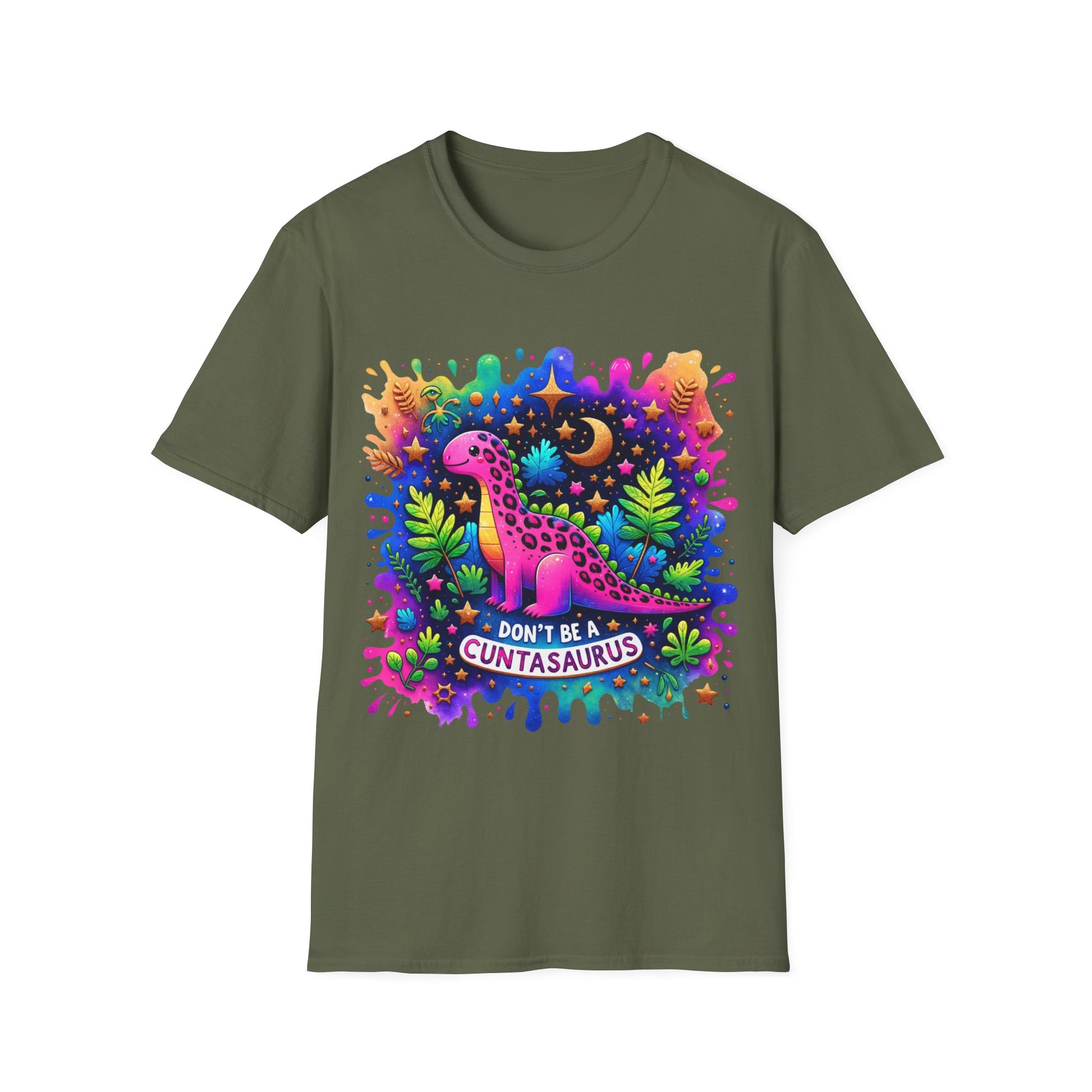 A graphic tee shirt with an edgy and humorous design that says 'Don't Be a Cuntasaurus'. Made from durable and smooth fabric, this unisex softstyle t-shirt is perfect for printing and feels comfortable to wear all year round. The classic fit and crew neckline offer a versatile style suitable for any occasion.